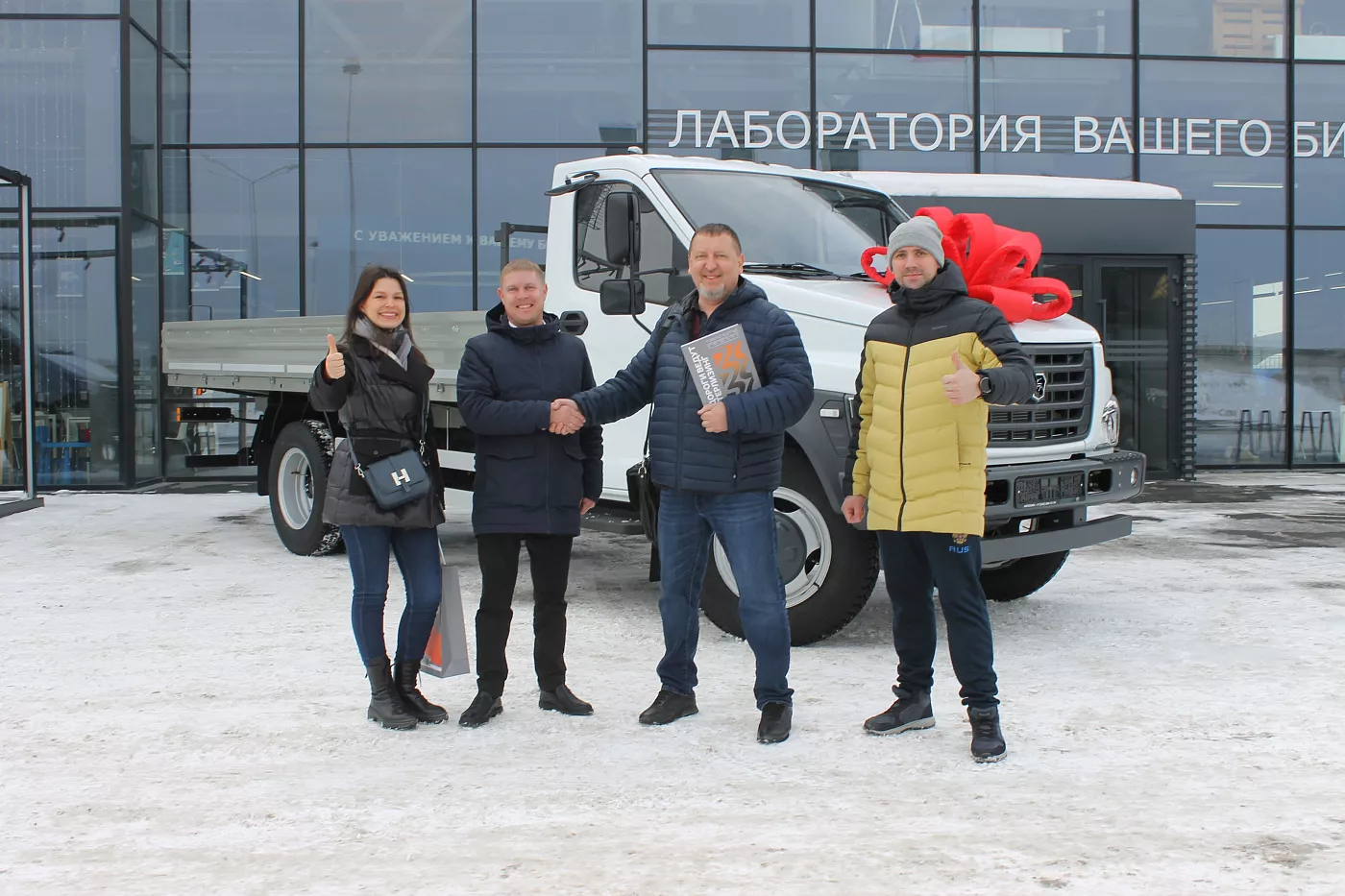 На фотографии Лимонов Павел Владимирович (генеральный директор компании «Электрогидромаш») принимает документы и ключи от нового ГАЗон NEXT, который уже задействован в регулярных перевозках оборудования. Этот момент символизирует очередной этап развития компании и укрепление собственной логистической системы.